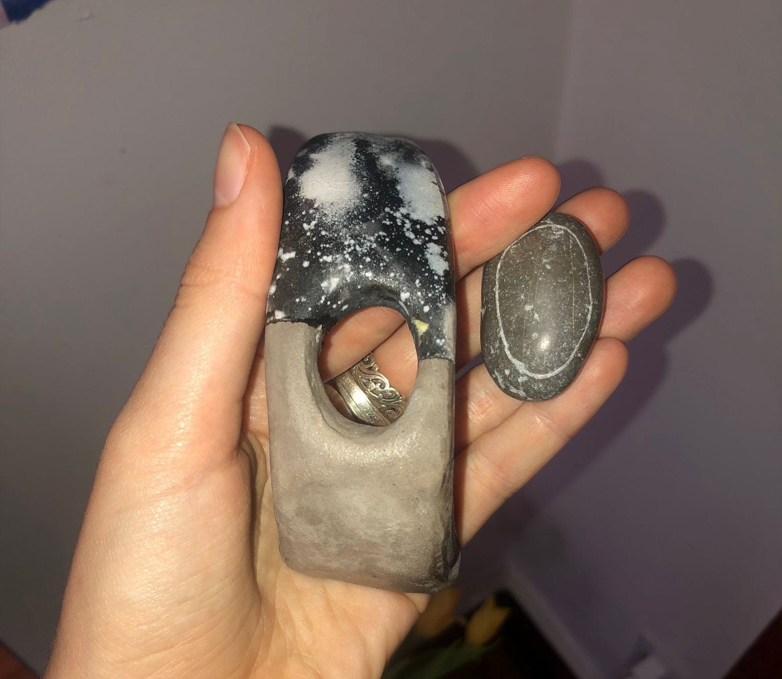 For my birthday, Gaby gifted me a candle holder. It broke while she was making it so she chucked the parts in two different sections of the pit fire and then glued the two pieces together. One side is splattered with light, the other isn’t: